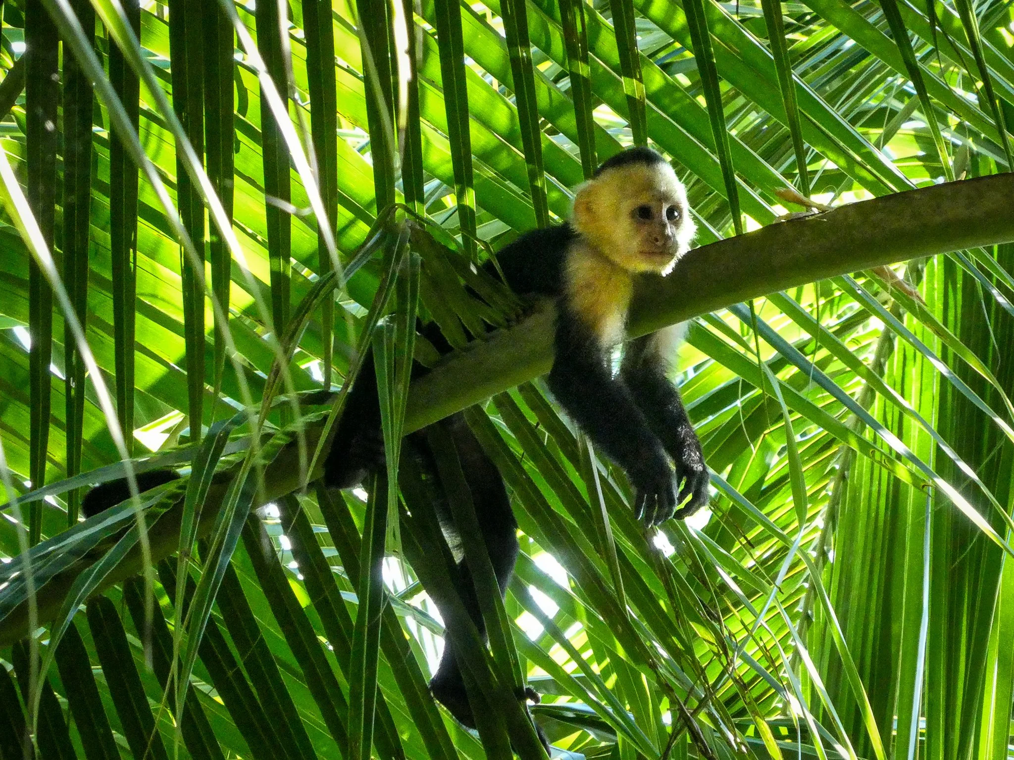 Da das Eintrittsticket für den Nationalpark den ganzen Tag gültig war, verbrachten wir den späteren Nachmittag, nachdem die Sonne nicht mehr allzu stark war, nochmals im Nationalpark. Diesmal nicht am Strand, sondern auf dem kleinen Wanderweg durch den Park. Wir waren praktisch alleine, das lag wohl an der kommenden Flut, denn ab sofort musste hüfttiefes Wasser durchquert werden, um den Wanderweg komplett abzulaufen. Dank Drybag und Bikini/Badehose stellte dies für uns kein Hindernis dar. Im fast menschenleeren Nationalpark begegneten wir einer Horde Kapuzineraffen und konnten mitverfolgen, wie sie erfolgreich eine Kokosnuss öffneten, um an das leckere Kokosnusswasser zu kommen. Es war interessant, diese Teamarbeit zu beobachten und zu sehen, wie immer mehr Affen dazu stiessen, um ebenfalls vom süssen Kokosnusswasser zu kosten.