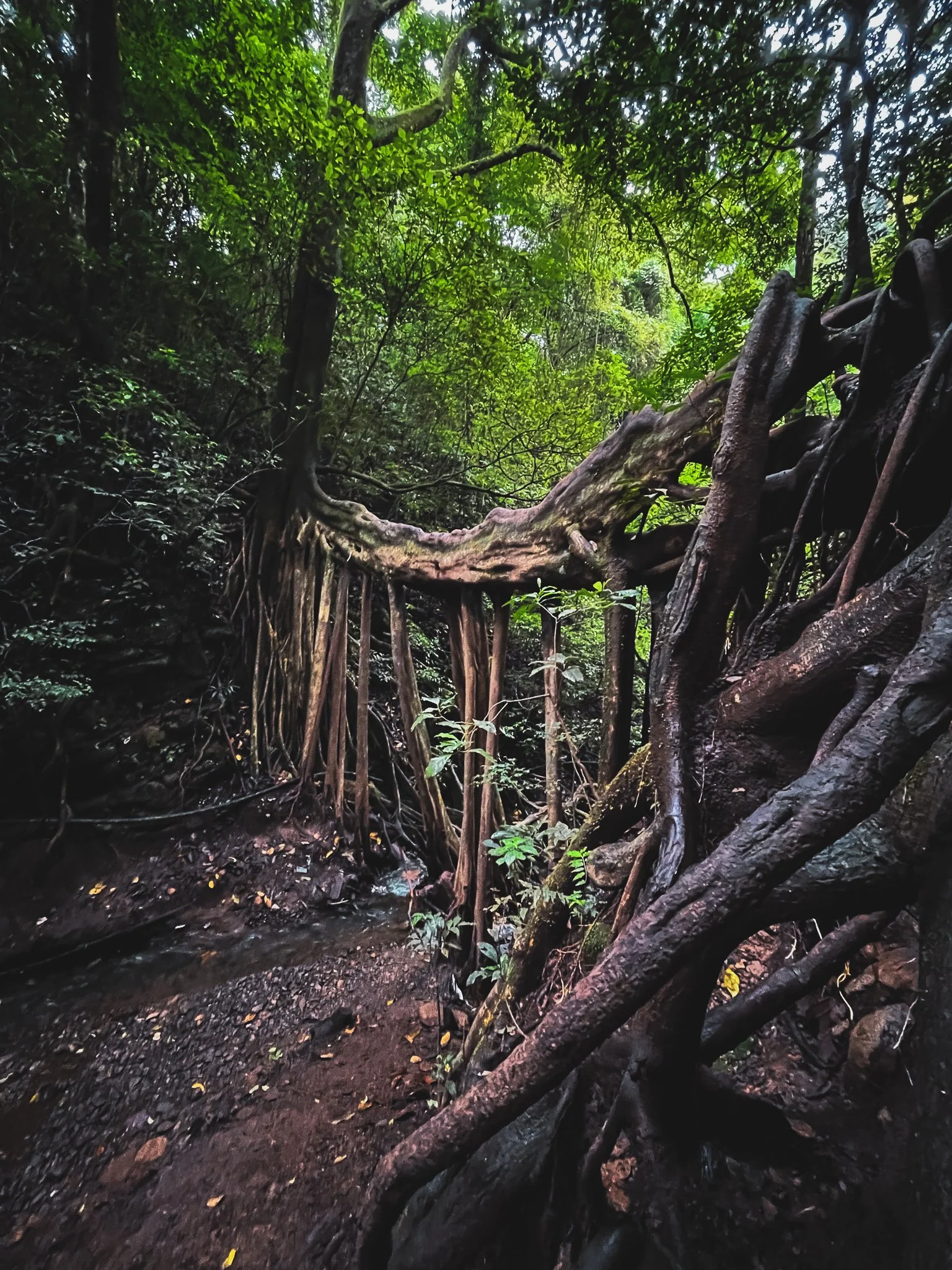 Als der Regen am Nachmittag etwas nachliess, spazierten wir spontan zu einem rund zehn Minuten entfernten Baum, dessen Wurzeln sich über einen Bach strecken und sozusagen eine natürliche Brücke bildet. Etwas schwierig zu erklären, daher hier das dazugehörige Bild. 😊